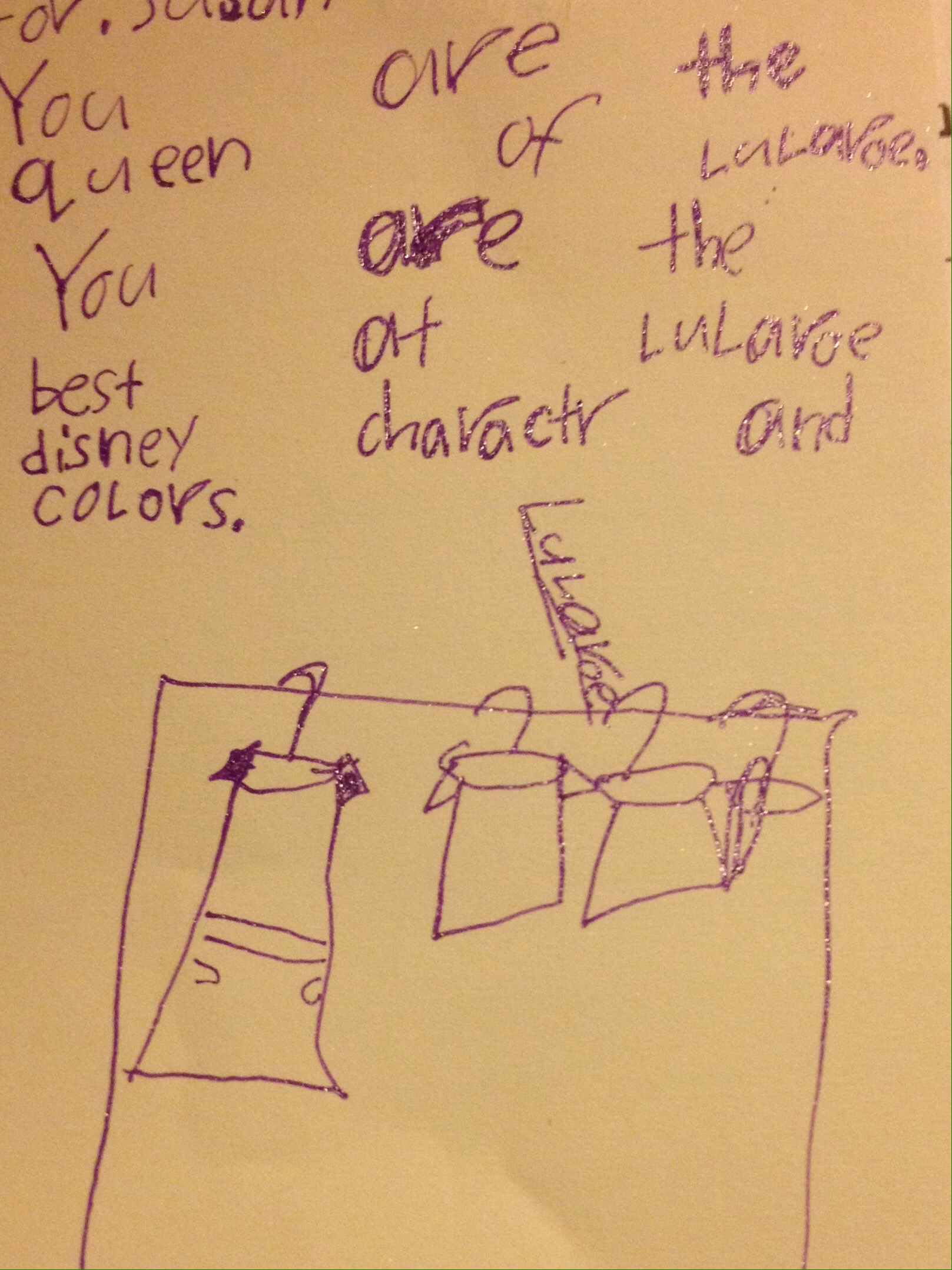 The business activities obviously have an effect on our family. Our older daughter drew the image above up this week. I love the picture of the clothes on the rack. I love the caption too: “You are the queen of Lularoe. You are the best at Lularoe disney character and colors [referring to a recent sales / merchandise promotion].”