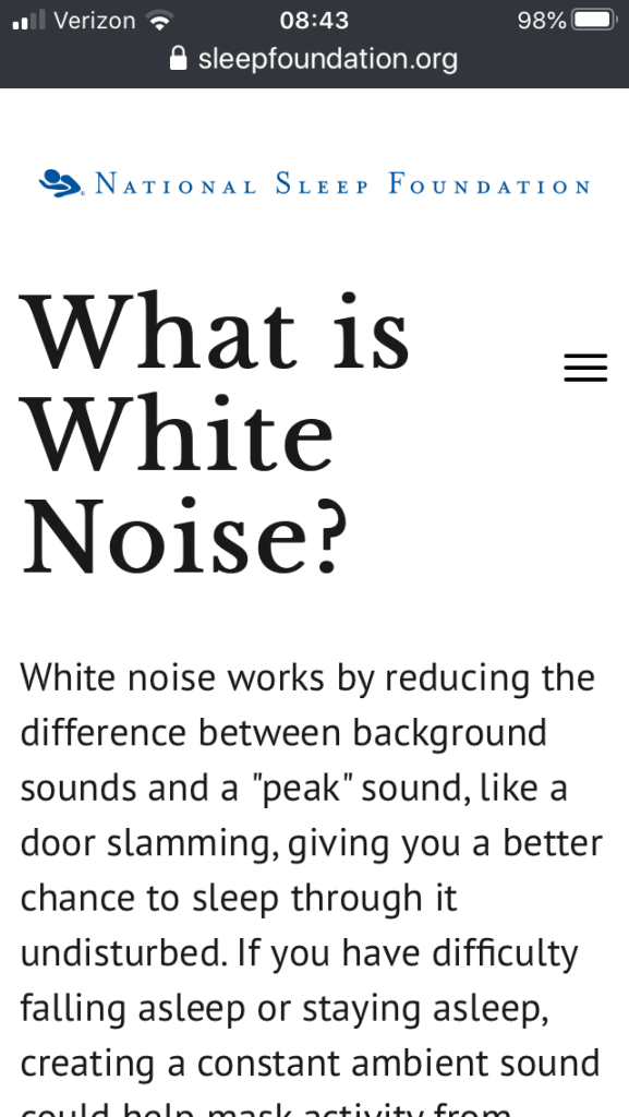 The National Sleep Foundation defines “white noise” as that which reduces the difference between background sounds and “peak” sounds.