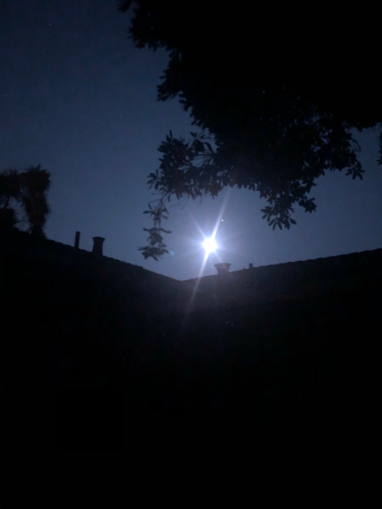 Six year old says it shines because of the sun, reflecting, her sister told her so. Bright light in the night sky, light the backyard campsite, keep us company throughout the night.