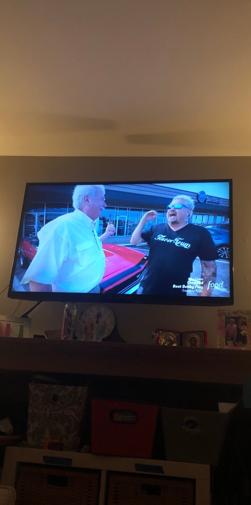 Room lighting just so, a fan blowing gently behind me, easy breeze, hum, glow from the screen on the wall delivering food network fun, light, soft-brain goodness. What’s on? “Diners, Drive-In’s, and Dives.”