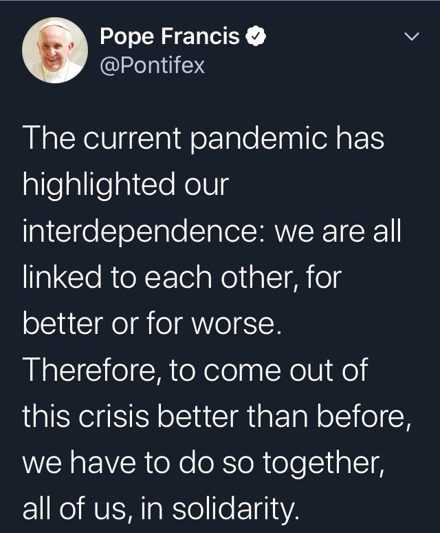 During these especially crazy times with so many variables in play, I find myself drawn to these simple ideas: interconnectedness, solidarity, mutual support and empathy, compromise for the common good.