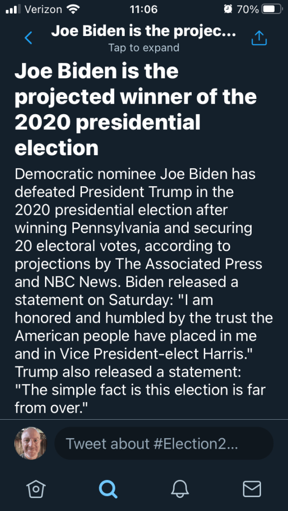 One America On November 8, 2020November 8, 2020 By jeff ludIn Attitude, culture, economy, human rights, Insight, leadership, lifestyle, politics, social change, social justice Let the healing begin. Let us come together. Let the politics recede and the work continue anew to make these United States of America a better place for ALL to live, in liberty and justice for everyone. EVERYONE. Share this:TweetLike Loading...