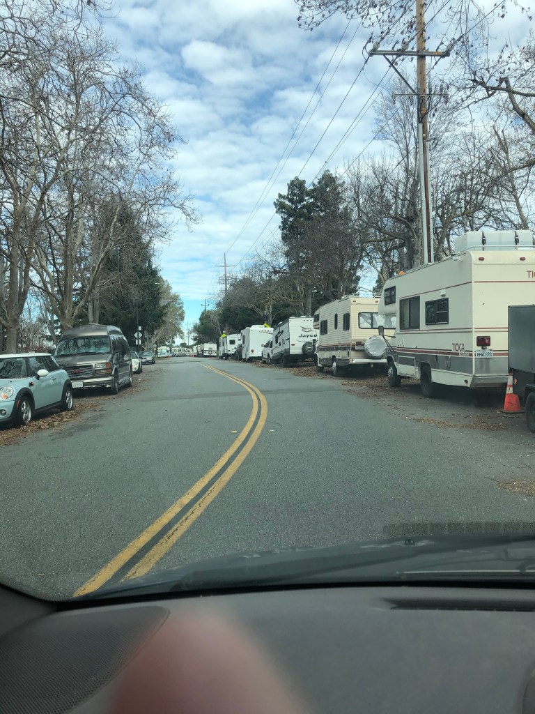 Down Garcia Drive, and South / East Bayshore Frontage Road in Mountain View, amongst the many buildings that house the likes of Google, YouTube, LinkedIn, there are campers after campers after campers.