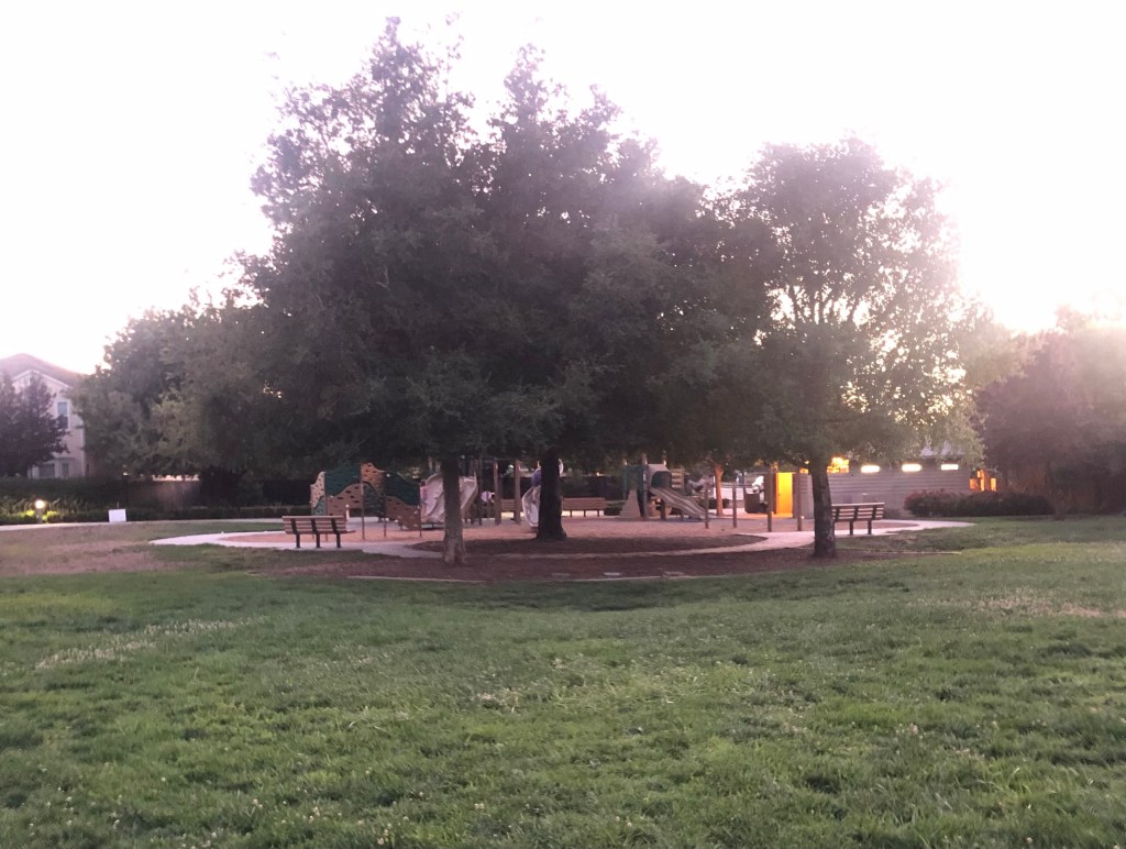 Two older ladies speaking Russian to my left, Sino dialect with a young family to my right, cool breeze drifting through the park, sun setting behind me,