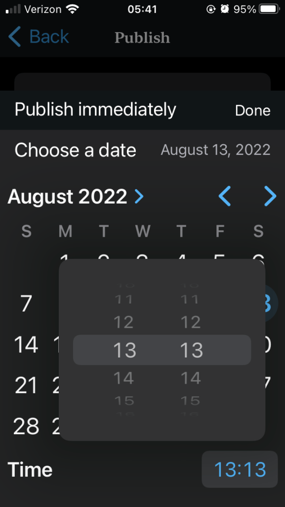 I like my blog entries to post at 1:13pm, 13:13 On the 24 Hour Clock. Silly habit I got into because I like the way it looks on the screen when I’m scheduling the post, 13:13.