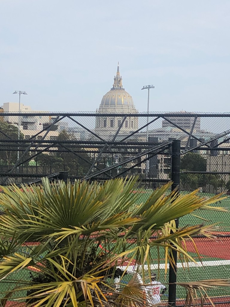 Parrot flock in the tree, clouds strewn in the air, shadow of City Hall, kids here and there, some Sabbath-dressed, not black, instead reverent, and with joy.