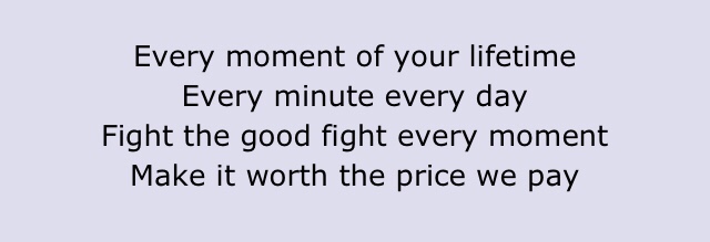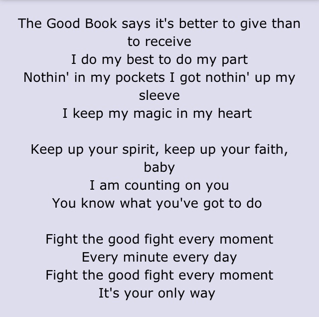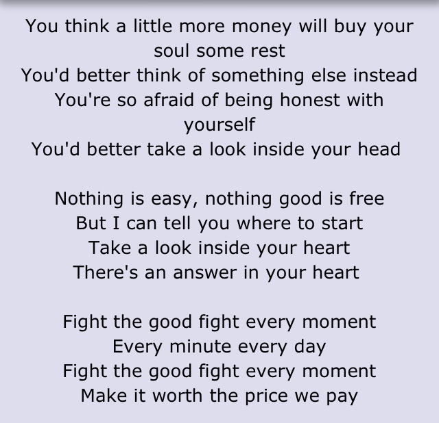 Lyrics Post: “Fight The Good Fight” On July 19, 2023July 16, 2023 By jeff ludIn Attitude One of the earliest, truest set of lyrics that poured to the depth of my soul and has remained, fueling me to this day, Share this:TweetLike Loading...