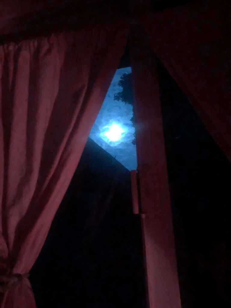 Looking through the kitchen window, early morning, moon still high in the sky, considering my state,