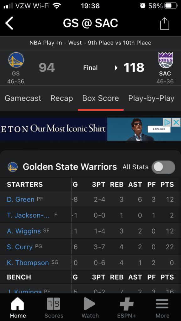 After the Warriors lost to the Kings, I listened to a couple guys talk about the game the next day, and they were talking the statistics as a way of describing why the Warriors fell short.