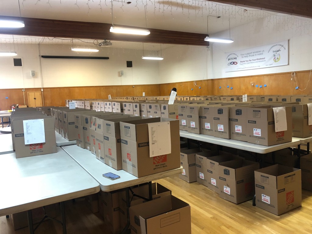 An empty gathering hall, some good organization and creative thinking by many Lions, and the massive generosity of many many people, come together to fill that empty hall over two days, culminating in two food boxes with a Thanksgiving turkey dinner and staples for about a week, for about 180 families, we figure that’s about thousand people. All through generosity and willingness to serve others.
